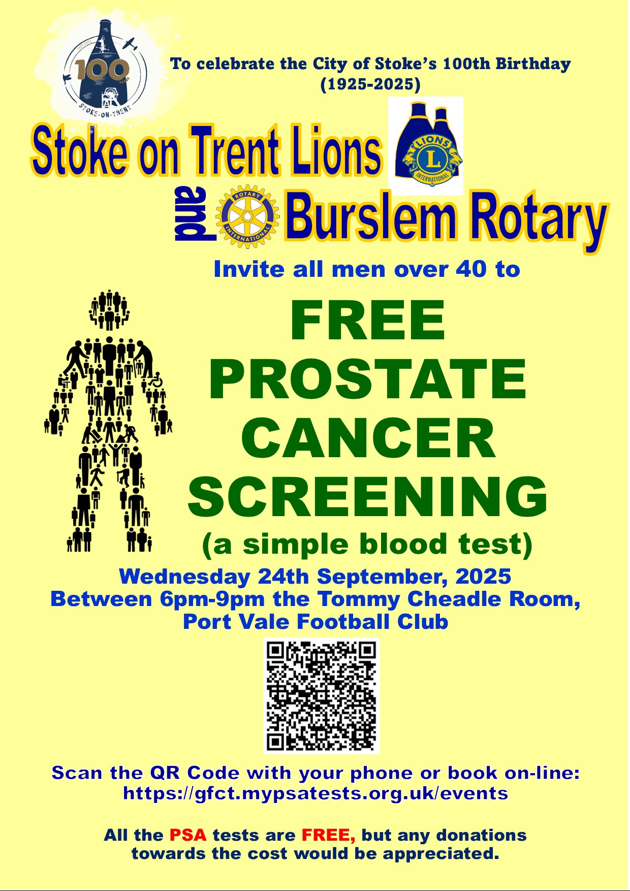 🎉 To celebrate Stoke’s 100th Birthday, Stoke on Trent Lions & Burslem Rotary invite men 40+ to a FREE Prostate Cancer Screening (simple blood test)!